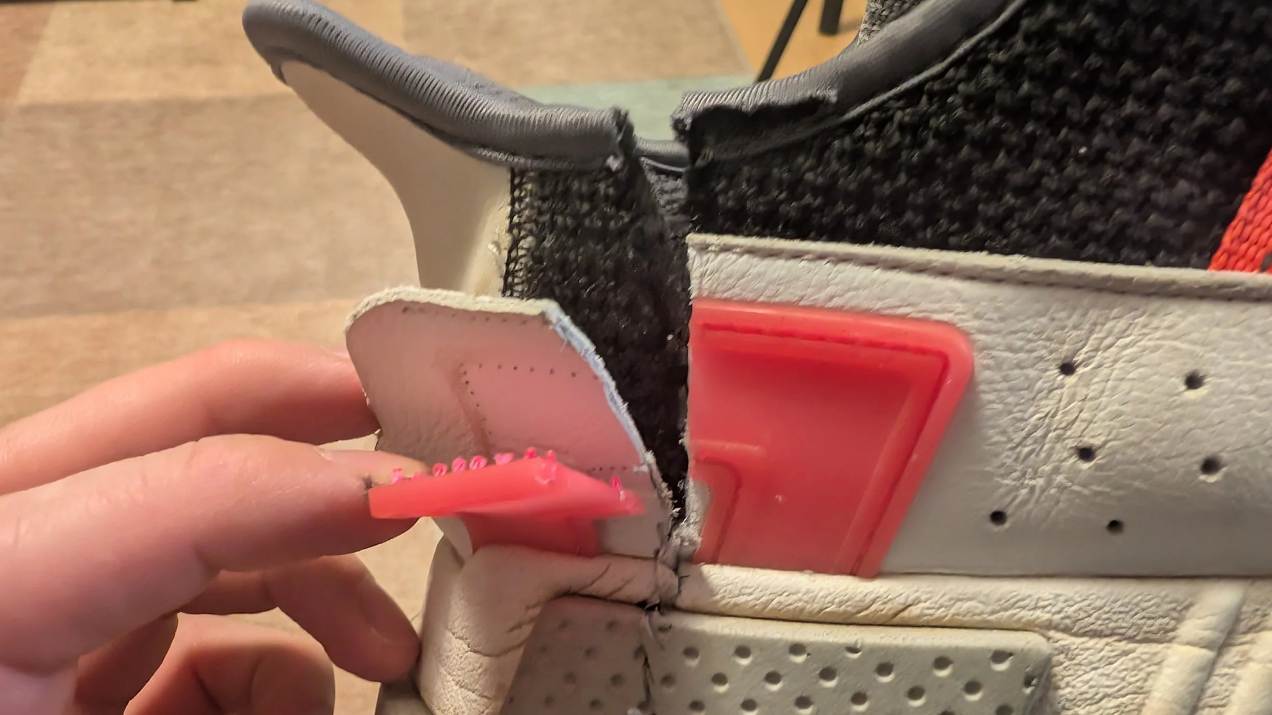 Added a shoe tag at the end of my running shoes to assist me when putting them on. The picture on the right shows the before and after. This was a great quick project to demystify shoes and add upgrades to the shoes.